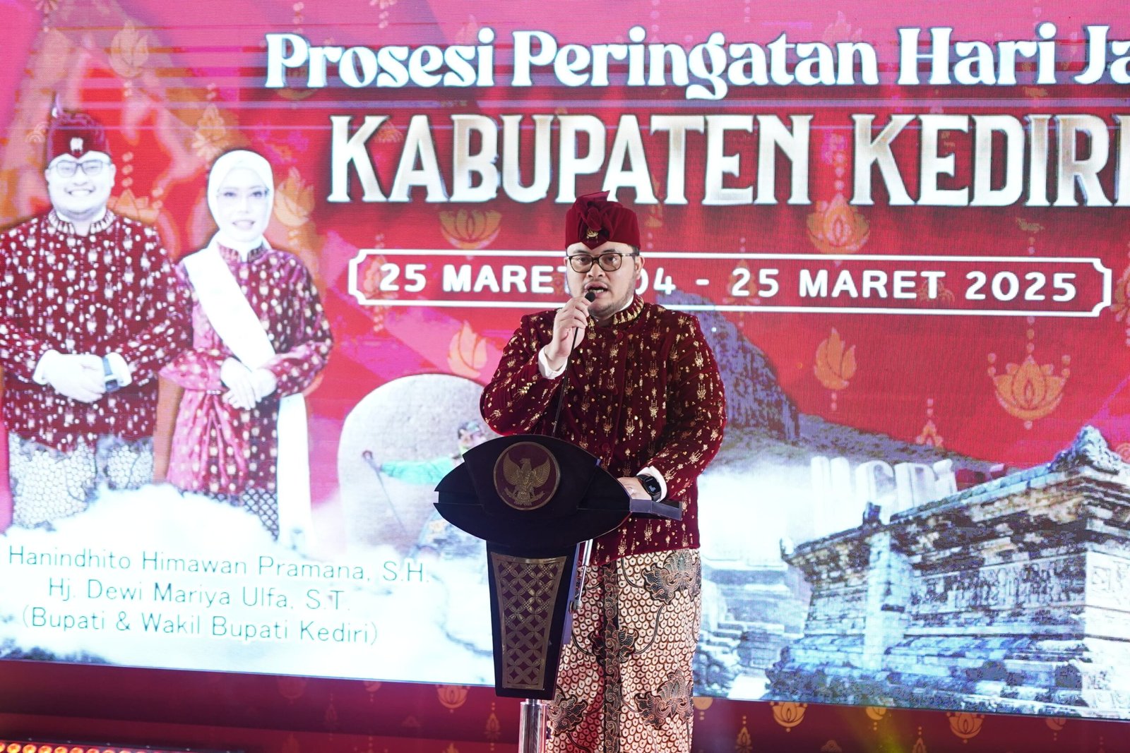 JENDELA INFORMASI, KEDIRI – Bertepatan dengan peringatan hari jadi ke-1221, Bupati Kediri Hanindhito Himawan Pramana mengajak seluruh elemen masyarakat bersinergi untuk dapat mengulang kembali sejarah kejayaan dan mewujudkan Kabupaten Kediri yang bebas dari kemiskinan ekstrem.