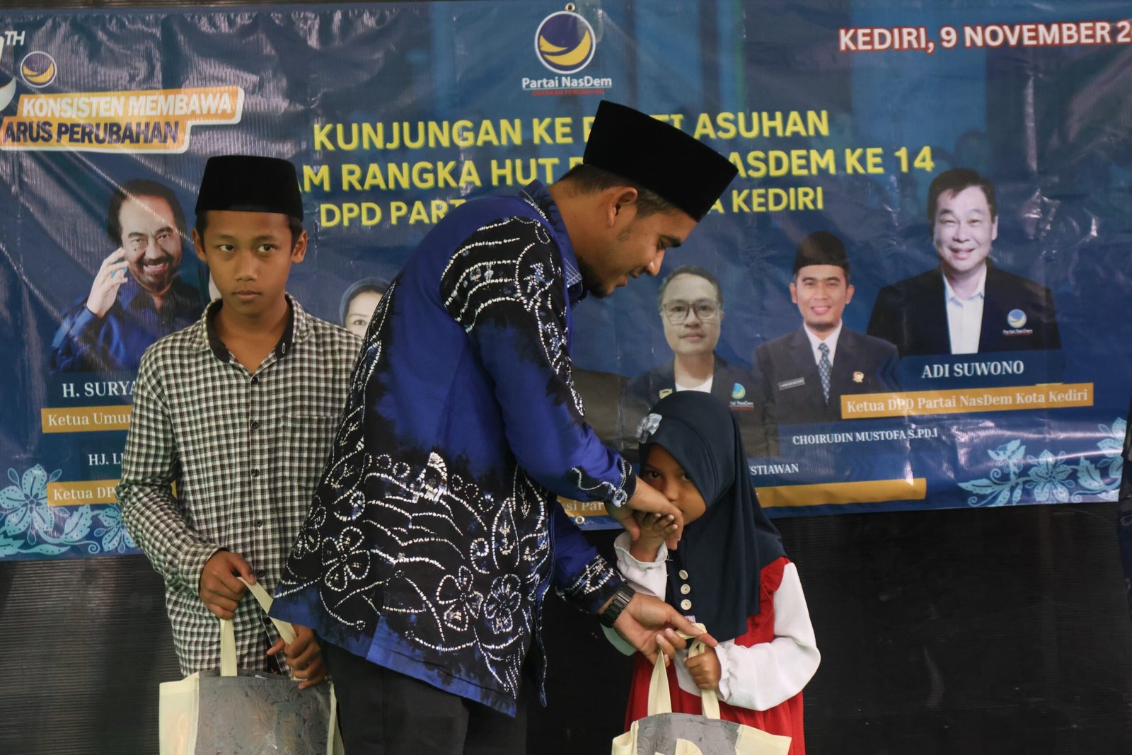 Sejumlah pengurus DPD, Ketua fraksi hingga seketaris partai turut hadir untuk memberikan bantuan santunan dan bingkisan secara langsung kepada sejumlah anak yatim. Dalam keterangannya ketua Fraksi Nasdem, Kota Kediri, Choirudin Mustofa mengatakan hari ini merupakan kegiatan yang kedua setelah sebelumnya diawali dengan donor darah pada tangggal 2 November 2025 lalu.